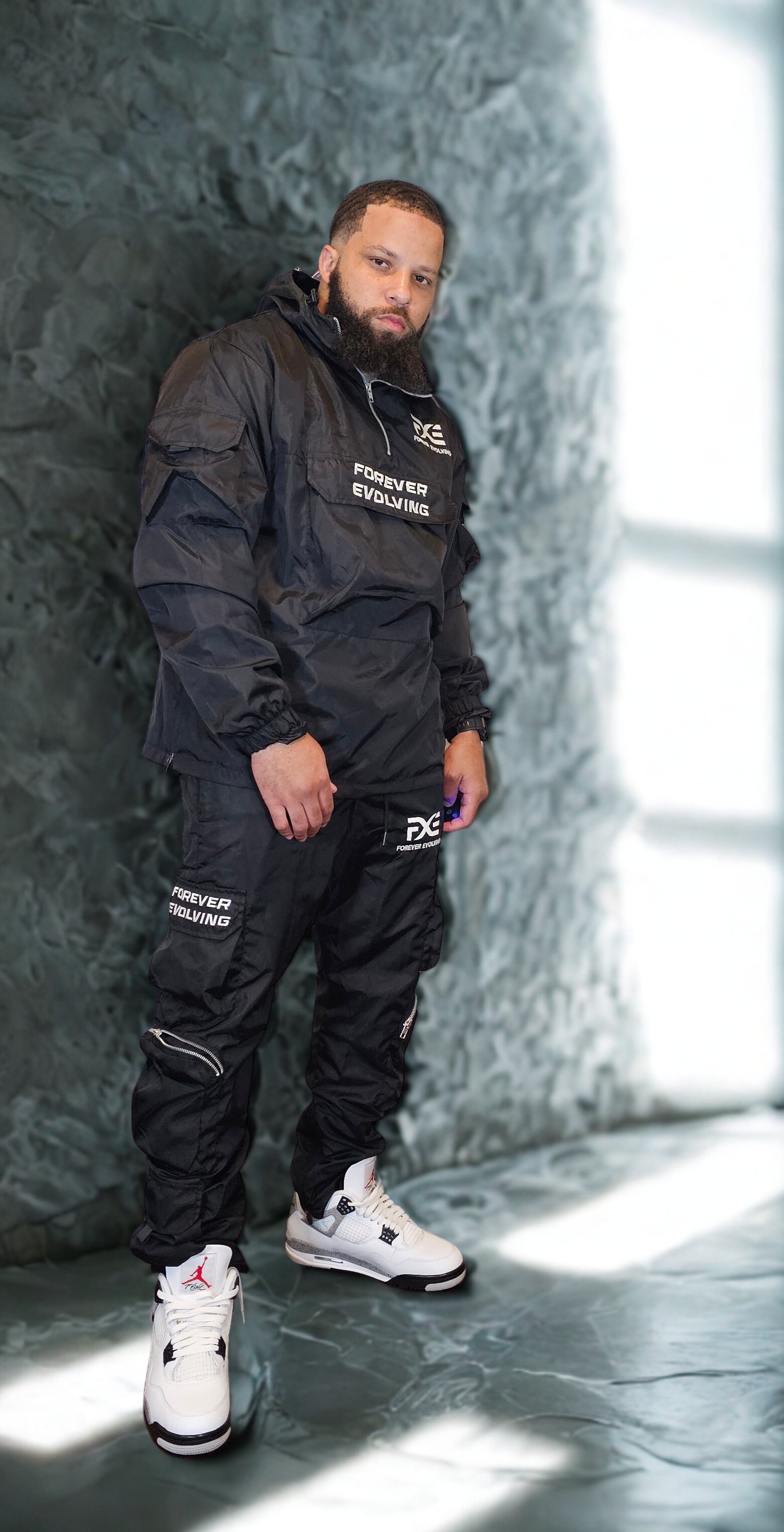 Discover unrivaled style with the Forever Evolving tracksuit! Crafted from durable black nylon, it offers comfort and a sleek look. Bold white embroidery adds a touch of flair, making it perfect for any setting. Upgrade your wardrobe with this eye-catching essential today.